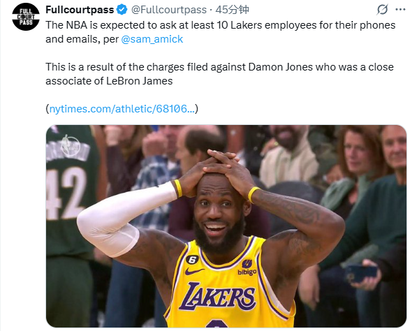 由于前NBA球员、詹姆斯的前投篮教练达蒙-琼斯(曾与湖人关系密切)被起诉,NBA所委托律所的调查人员预计将向至少10名湖人员工索要手机及通话记录等资料。