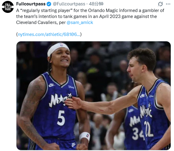 据悉,有一些其他球队也出现在联邦指控中,涉及围绕其比赛的非法投注活动,其中包括奥兰多魔术。根据指控,魔术队一名“常规首发球员”曾告知赌徒球队计划在2023年4月对阵克利夫兰骑士的比赛中“摆烂”(即让主力休战),该赌徒涉嫌将信息转售给其他参与博彩者下注。